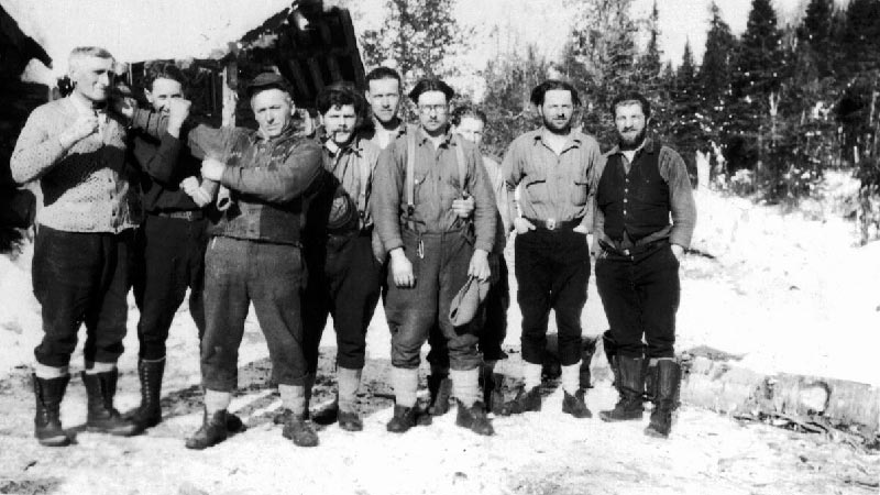 Description: A group of loggers (lumberjacks) in front of the camp at Second Lake in the winter of 1930. From left to right: Mr. Eustache Soucy, Mr. Pit Paul Lagacé, Mr. Georges Lavoie, Mr. Barthy Smyth, Mr.Edmond Beaulieu, Mr. A. Bérubé, Mr. Abel Thidodeau, Mr. Léon Bérubé, and Mr. Alphé Smyth. They all worked for the Green River Lumber Ltd.