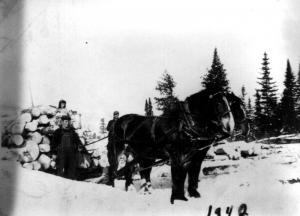 Description : Les chevaux étaient généralement utilisés pour transporter les billots jusqu'aux cours d'eau. Sur cette photo, dans les années 1940, trois bûcherons et un attelage de deux chevaux sont prêts pour le halage.
