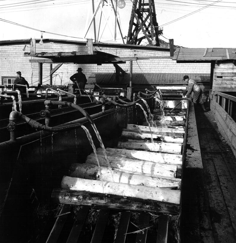 Description : Les écorceuses de l'usine Fraser d'Edmundston retiraient l'écorce des billes de 4 pieds dans les années 1940. On voit un travailleur dégageant les billes avec un sapi. Les grands robinets acheminaient l'eau de la rivière pour laver les billes. On remarque qu'il n'y a pas de toit au-dessus des écorceuses puisqu'elles opéraient seulement de la fin printemps jusqu'au début de l'automne. Ce bois provenait des monte-billes situés le long de la rivière Madawaska. Une fois le bois écorcé, il était transporté par un convoyeur jusqu'à l'intérieur de l'usine ou placé en pile pour les opérations d'hiver.